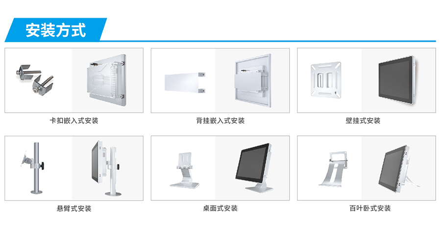 支持嵌入式安裝、壁掛式安裝、懸臂式安裝,桌面式安裝和百葉臥式安裝,應(yīng)用場景多,滿足醫(yī)療環(huán)境下對不同尺寸和不同安裝方式的需要。