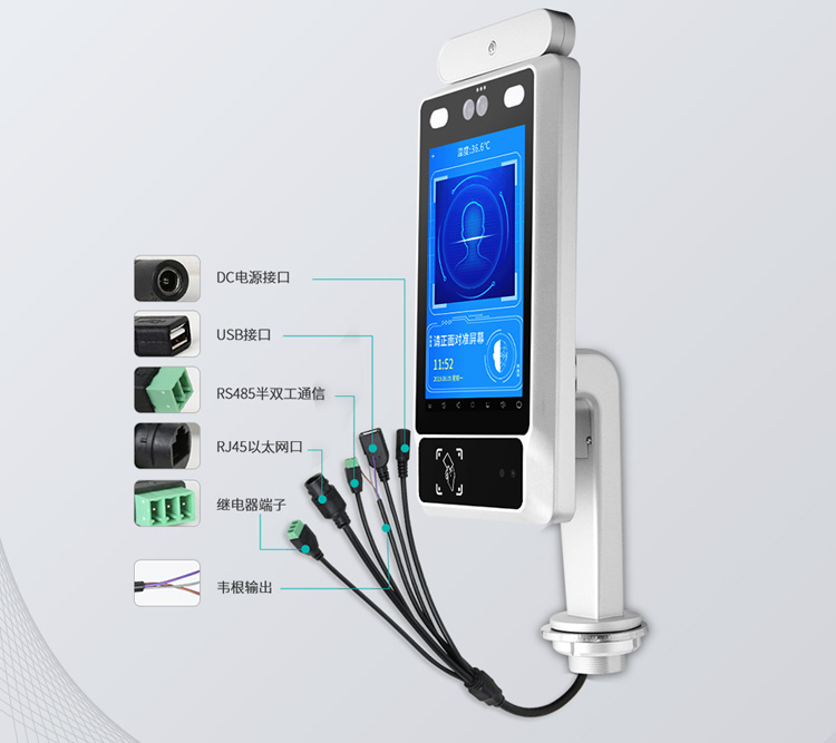 8寸人臉識別測溫終端,融合人臉識別算法,在機器視覺、大數(shù)據(jù)和云計算等技術(shù)的加持下,能實現(xiàn)精準識別、無接觸式測溫,滿足人員出入身份核驗、行程記錄、體溫監(jiān)測等工作需要,且可以7X24小時不間斷運行,體溫異常觸發(fā)警報。