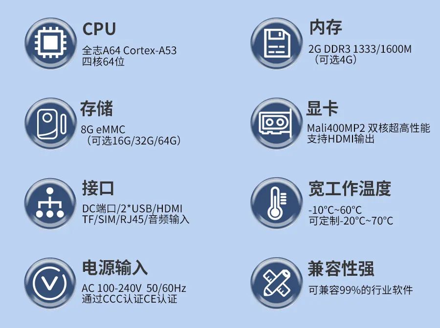 標(biāo)配全志A64Cortex-A53四核64位處理器,2G DDR3 8G eMMC 搭配Android6.0系統(tǒng),支持本地SD、USB升級。
