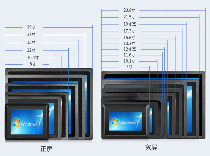 目前,嵌入式系列共有14個(gè)尺寸:7、8、10.1、10.4、11.6、12、12(寬屏)13.3、15、15.6、17、17.3、19、19(寬屏)、21.5、23.8。