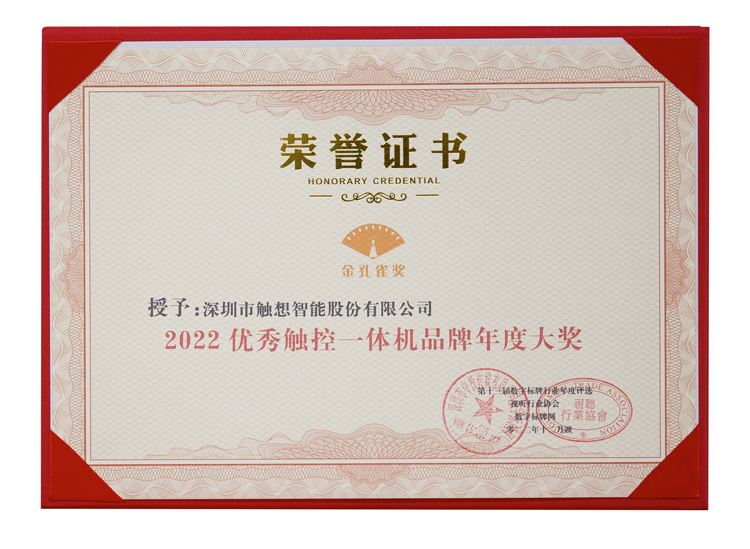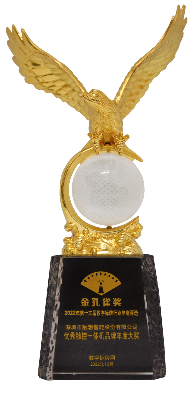 大會(huì)同期頒發(fā)了數(shù)字標(biāo)牌行業(yè)最高榮譽(yù)“金孔雀獎(jiǎng)“,經(jīng)過(guò)近三個(gè)月、數(shù)百家優(yōu)秀企業(yè)的激烈角逐,觸想智能憑借在創(chuàng)新引領(lǐng),產(chǎn)品美譽(yù)、市場(chǎng)認(rèn)同方面的卓越表現(xiàn),實(shí)力斬獲金孔雀獎(jiǎng)——2022優(yōu)秀觸控一體機(jī)品牌年度大獎(jiǎng)。