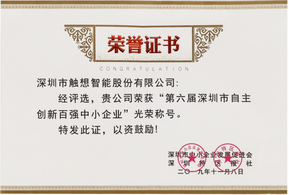 深圳市觸想智能股份有限公司(簡稱:觸想智能)憑借優(yōu)異的自主創(chuàng)新實力,榮獲“深圳市自主創(chuàng)新中小企業(yè)百強”稱號!本次評選活動是經(jīng)過審核評估組專家前期的實地考察、聽取自主研發(fā)創(chuàng)新的工作匯報、與研發(fā)人員的技術(shù)交流、了解產(chǎn)品的核心競爭優(yōu)勢以及企業(yè)的未來發(fā)展規(guī)劃等工作進行了全面的評估,在近3000家報名企業(yè)中,經(jīng)過嚴格的評選程序脫穎而出,成為深圳市200多萬中小企業(yè)的優(yōu)秀代表之一!