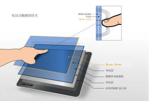 2)電容屏:全稱(chēng)為電容式觸摸屏,俗稱(chēng)“硬屏”,是一塊四層復(fù)合玻璃屏,第一層是ITO,用以保證工作環(huán)境,第二層是玻璃,第三層也為ITO涂層,做工作面使用;第四層則是矽土玻璃保護(hù)層。