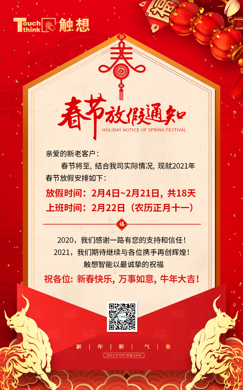 2021年春節(jié)即將來(lái)臨,為歡度中華民族的傳統(tǒng)節(jié)日,讓大家度過(guò)一個(gè)歡樂(lè)、祥和的春節(jié),根據(jù)《國(guó)務(wù)院辦公廳放假通知》并結(jié)合公司實(shí)際情況,經(jīng)研究春節(jié)假期安排如下: